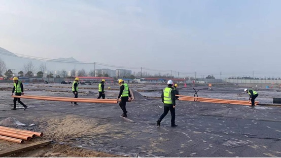 年三十,混凝土初凝,均在養(yǎng)護期內,吊裝設備雖不能進場,但項目建設進度絲毫沒有懈怠。參建各方組織力量,搶抓能夠施工的地方,項目管理人員放棄節(jié)假日奔赴現(xiàn)場指導施工,水電班組全員到崗鋪設水電管道,為下一步準備區(qū)、緩沖區(qū)的板房安裝及隔離區(qū)的打包房安裝做好充足的準備工作。